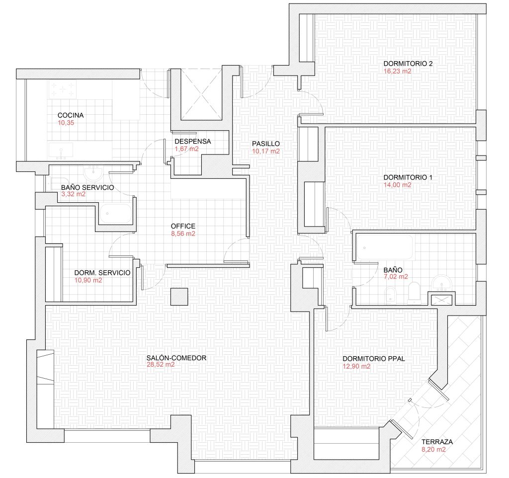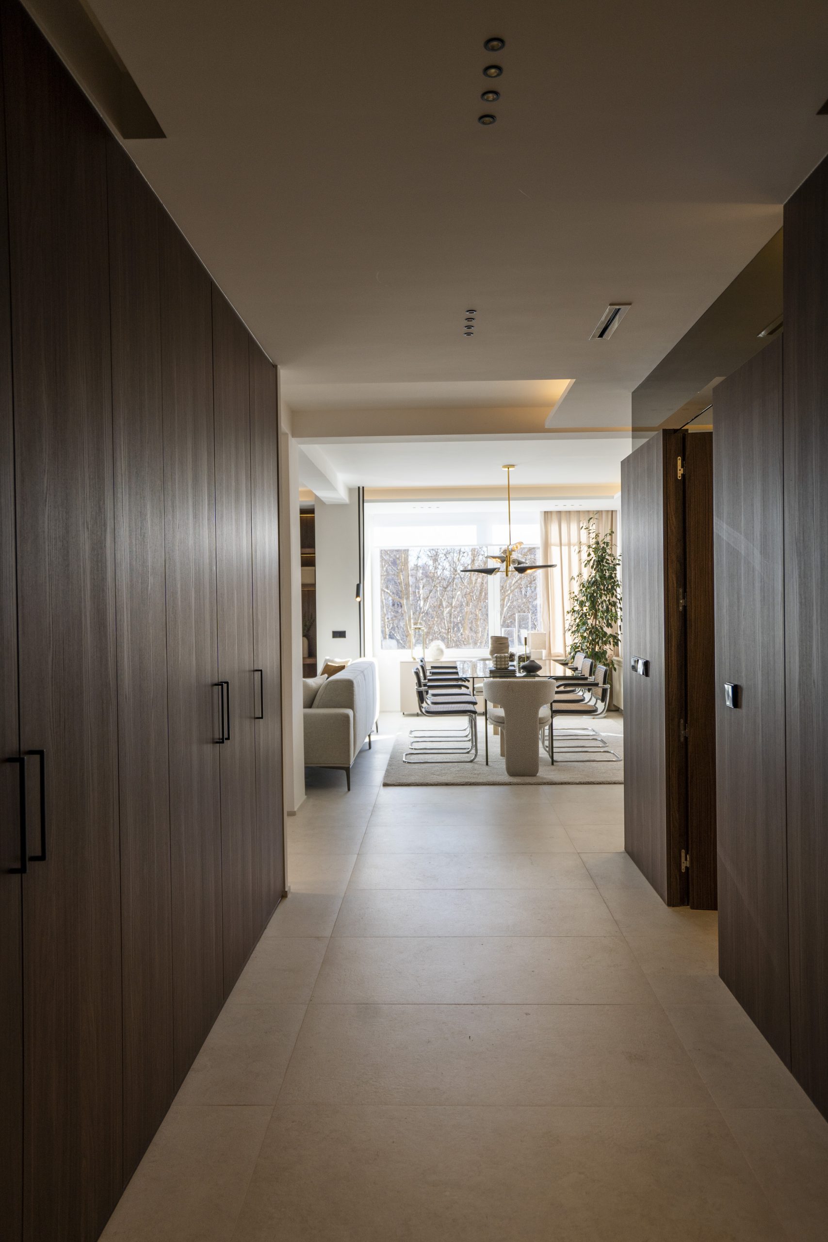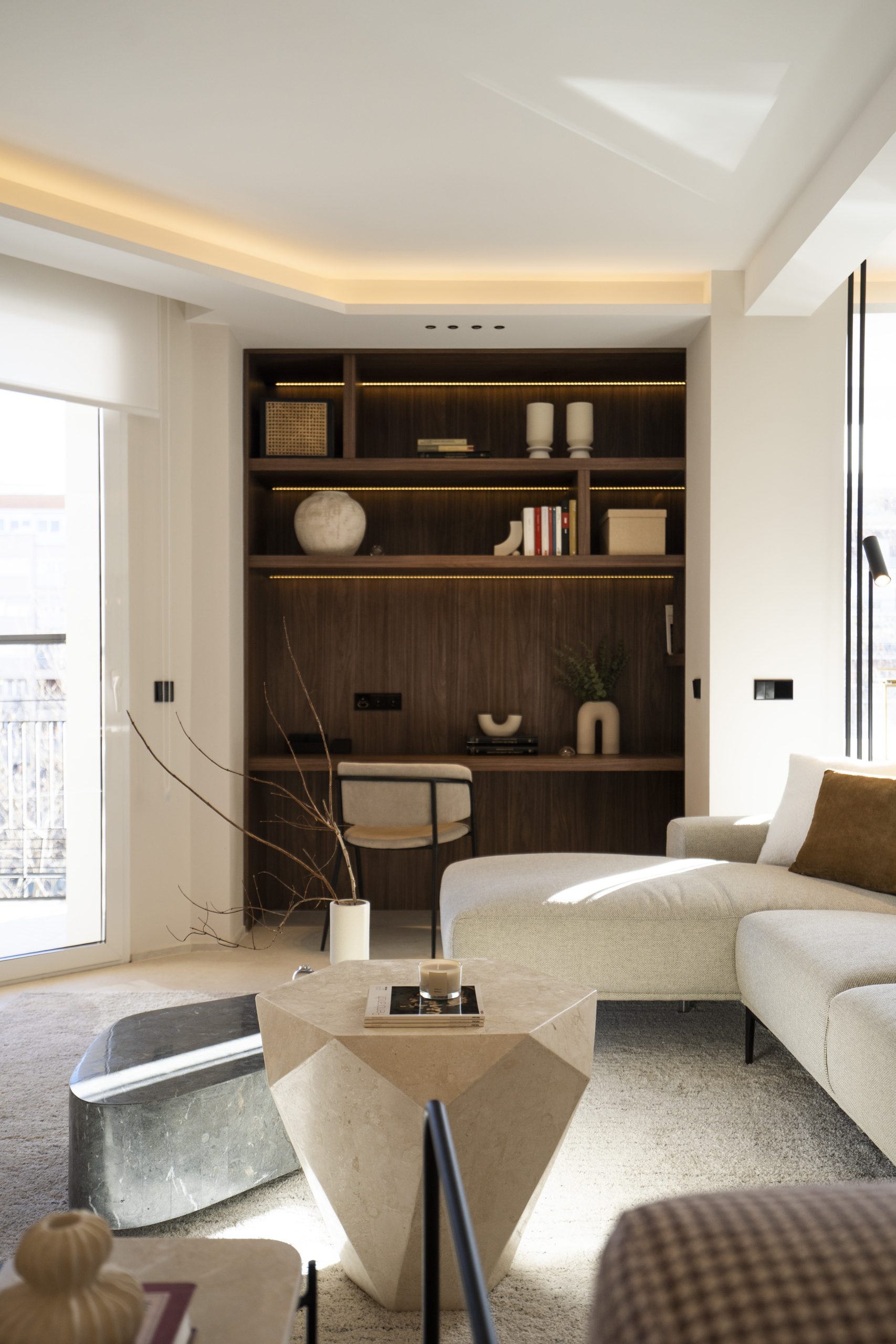 En este proyecto de reforma integral e interiorismo para esta vivienda de 165 m², transformamos completamente la distribución, logrando una configuración funcional y moderna que maximiza cada espacio y elimina los pasillos al completo para optimizar la superficie útil de la misma. La nueva propuesta incluye tres dormitorios, dos de ellos en suite, un baño completo adicional y un aseo de cortesía en la zona de día, que refuerza la privacidad y el confort de sus ocupantes. En cuanto a la estética, dimos especial atención a la elección de materiales y tonalidades, con maderas oscuras que dan un aire sofisticado a cada ambiente, complementadas con una iluminación estratégica que potencia el carácter elegante.