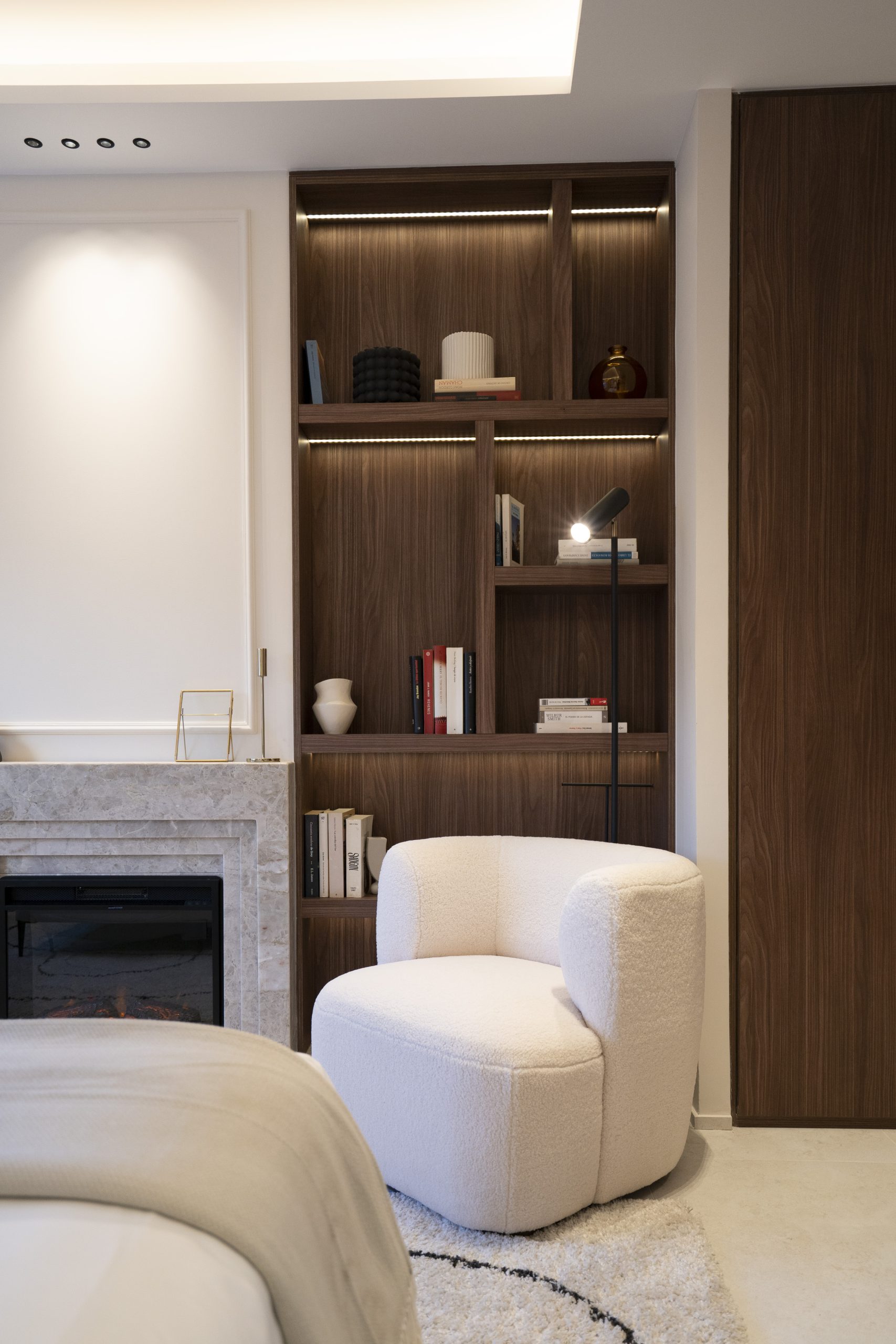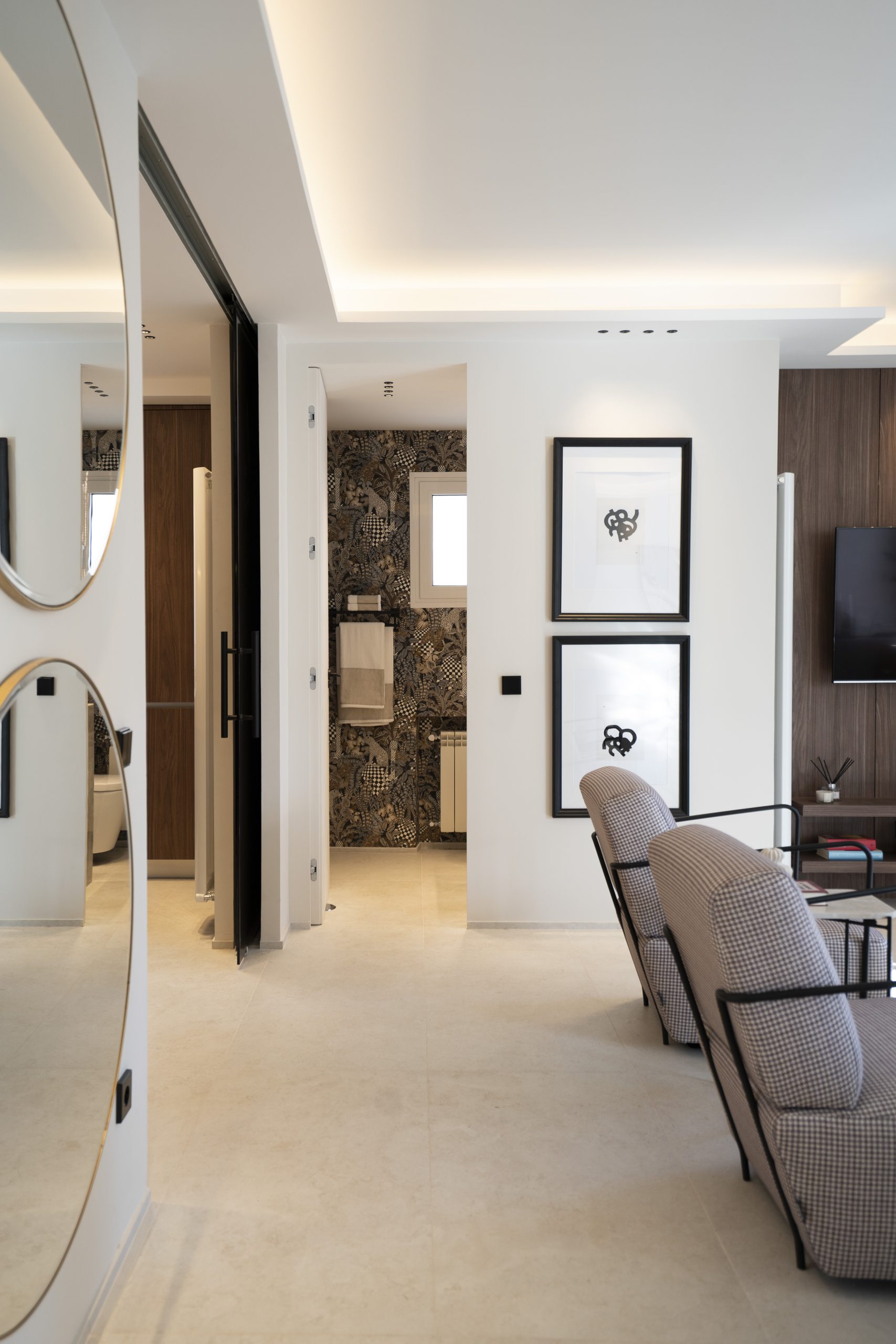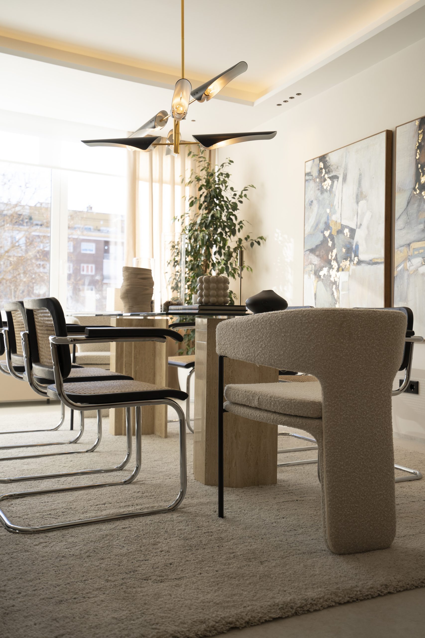 En cuanto a los detalles decorativos, se ha optado por elementos de acento que añaden un toque único. Destacan, en el salón, las butacas de textil estampado, que aportan un punto de contraste y personalidad al entorno monocromático, siendo piezas que llaman la atención sin romper con la estética sobria y elegante. Con este conjunto de decisiones de diseño, logramos que la vivienda sea un espacio de gran estilo y funcionalidad, al nivel de las exigencias del cliente.