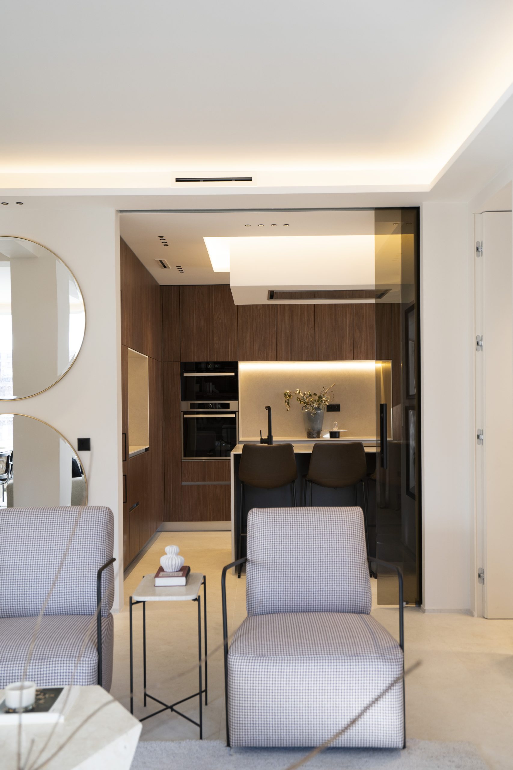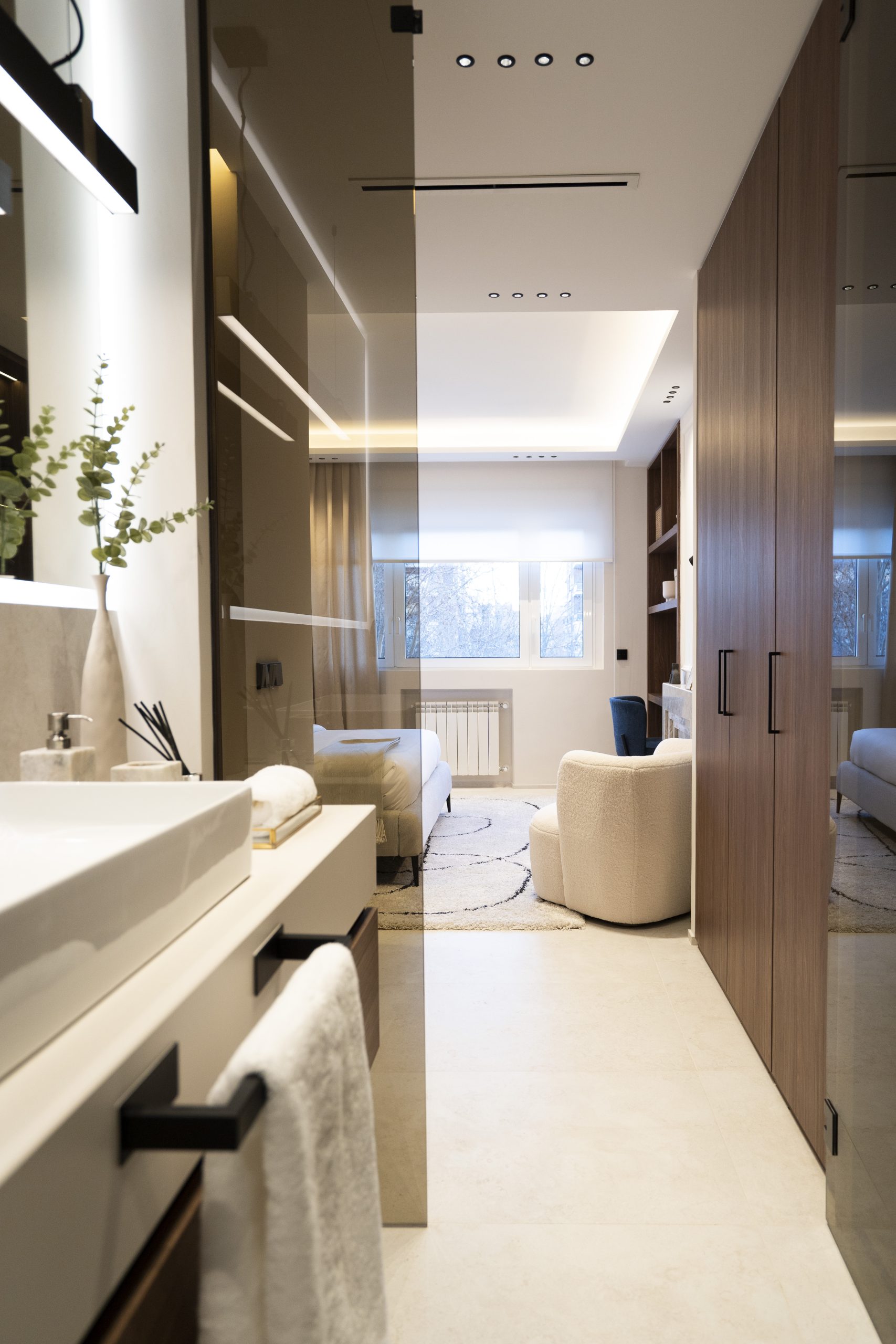 La iluminación artificial en toda la vivienda es uno de los aspectos clave del proyecto. Cada estancia cuenta con candilejas retroiluminadas, que suavizan y realzan las texturas de paredes y techos, creando un ambiente acogedor sin perder la sensación de amplitud. Al mismo tiempo, el rediseño ha logrado aprovechar al máximo la luz natural, ampliando visualmente los espacios y otorgándoles un aire más abierto y luminoso. La cocina, por petición de los clientes, fue planteada de manera independiente al salón-comedor, pero conectada visualmente con unas puertas correderas de vidrio ahumado, a juego con los instalados en el resto de la vivienda.